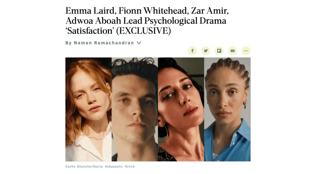 “Emma Laird (“A Haunting in Venice,” “Mayor of Kingstown”), Fionn Whitehead (“Dunkirk,” “Port Authority”), Zar Amir (“Holy Spider,” “Shayda”) and Adwoa Aboah (“Top Boy,” “Willow”) star in psychological drama Satisfaction.